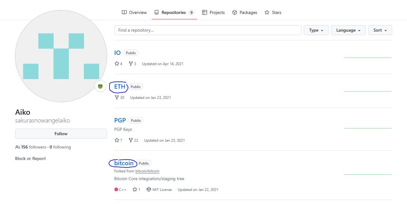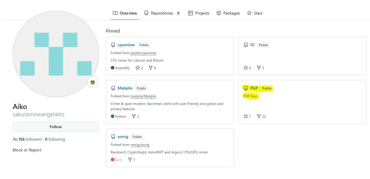 I checked the GitHub first. This repo called PGP keys looked promising. PGP is a popular encryption program used to secure email communications, files, and other data. Not really something you should be sharing on your very public profile!