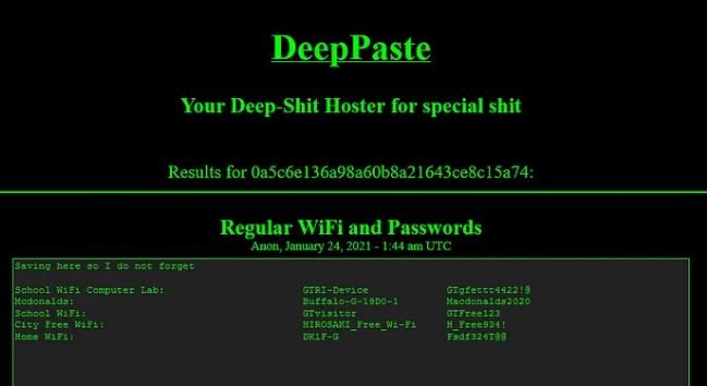 Off to the Dark Web I went. I searched for sites that might be related to “Deep search”, “Deep Paste”, “Search Paste” etc. Based off on the attacker’s hints. I came across Deep Paste, which allows users to paste any text they want into the site. I looked up the Hash from Aiko’s tweet: “0a5c6e136a98a60b8a21643ce8c15a74” and got the information I was looking for.